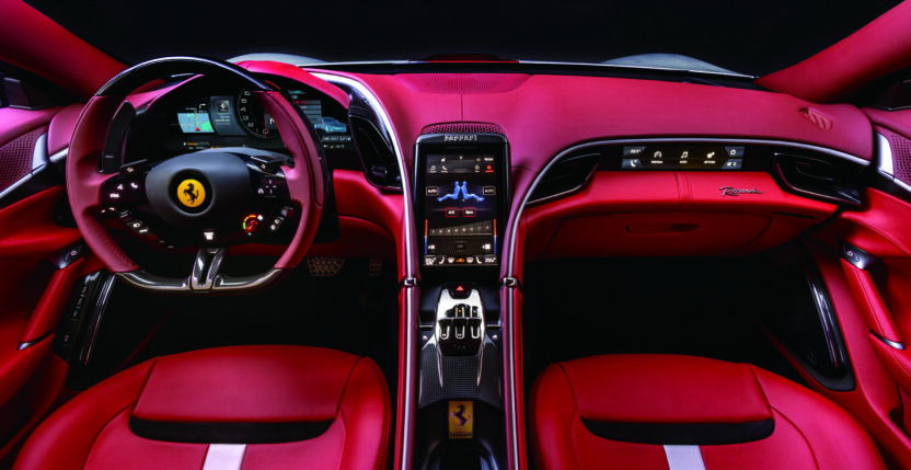 로마의 내부는 가죽, 알칸타라 소재로 마감된 고급스러운 실내를 제공하며, 운전자 중심의 디지털 디스플레이와 터치 인터페이스로 현대적인 감각을 더했습니다.